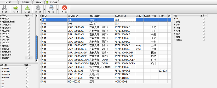 4、商品属性支持‘主-从’体系结构,原厂配件与副厂、高仿等建立相互渗透的关系,无需另建互换码;商品属性支持“别名”,“别码”的录入与查询,避免因地域、风俗问题而引起对同一商品不同称呼的定位麻烦;商品分类支持树状结构,其查询也严格按照分级特性,查询某分类就可以到本级及其下级分类商品;商品属性支持多种车型的配对。车型成树状结构,其查询也严格按照分级特性,查询某车型就可以查询到本级及其下级的车型对应的商品;商品属性支持无限图片展示,不同店之间图片能够轻松实现共享。