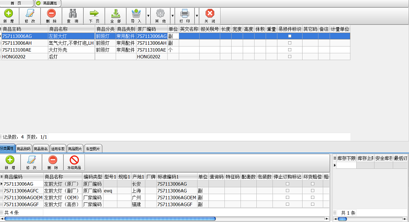 4、商品属性支持‘主-从’体系结构,原厂配件与副厂、高仿等建立相互渗透的关系,无需另建互换码;商品属性支持“别名”,“别码”的录入与查询,避免因地域、风俗问题而引起对同一商品不同称呼的定位麻烦;商品分类支持树状结构,其查询也严格按照分级特性,查询某分类就可以到本级及其下级分类商品;商品属性支持多种车型的配对。车型成树状结构,其查询也严格按照分级特性,查询某车型就可以查询到本级及其下级的车型对应的商品;商品属性支持无限图片展示,不同店之间图片能够轻松实现共享。