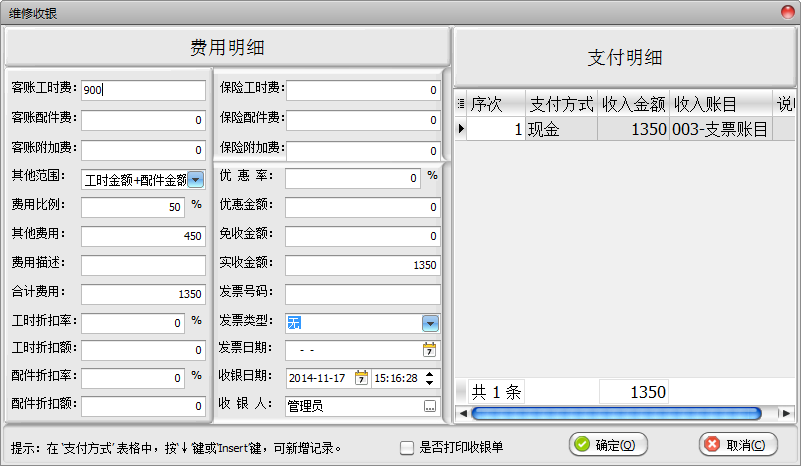 7、维修开单界面简洁实用,同一个项目或商品支持多种账类;打印工单可以筛选个别信息进行打印;提供回访内容快速录入接口。