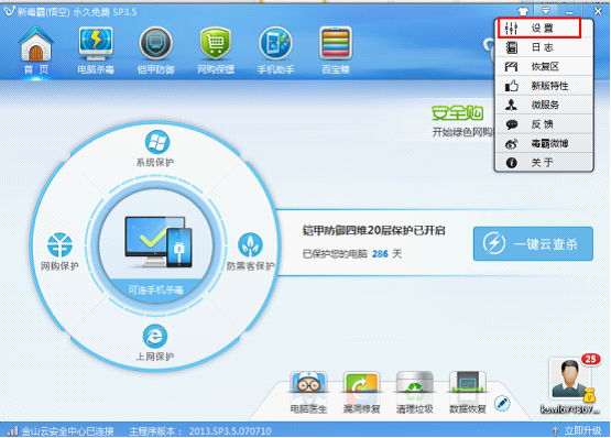 先打开新毒霸主界面,在右上角点击下拉按钮,选择设置菜单