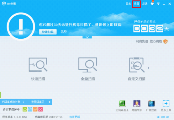 先打开360杀毒软件主界面,点击右上角设置按钮
