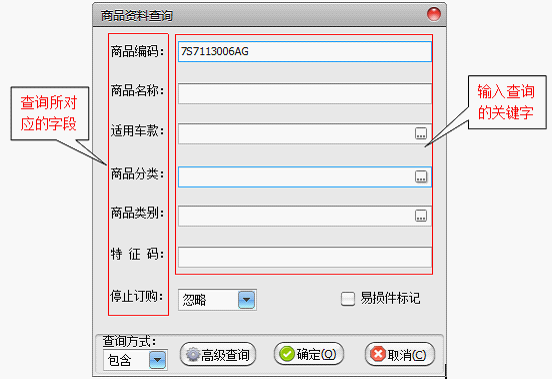 例如:关键字“7S7113006AG”对应的是“商品编码”