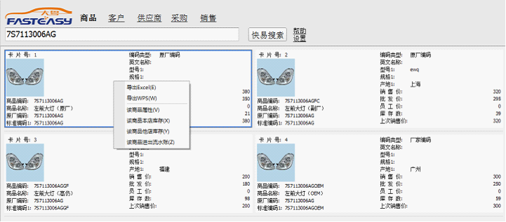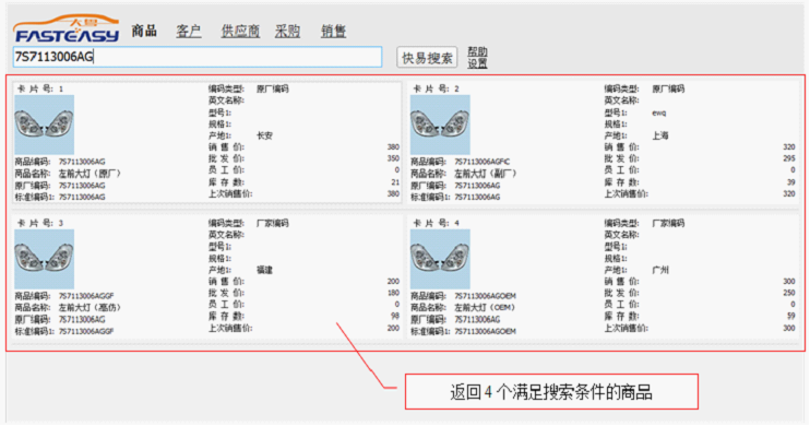 如上图所示,输入关键字为商品编码,然后直接回车或点击“快易搜索”按钮,返回结果如下图
