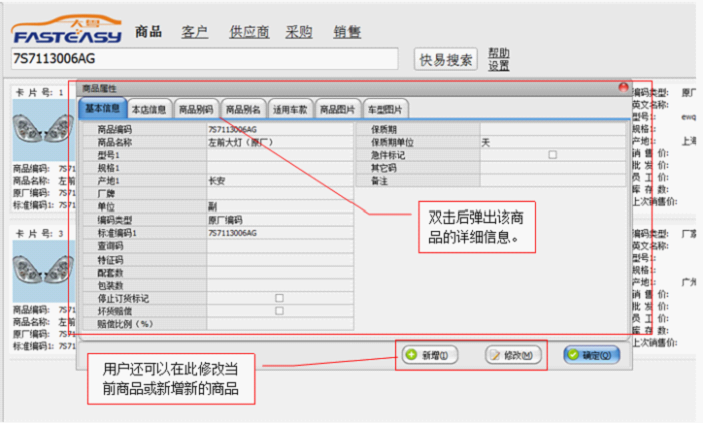如上图所示,返回的是满足搜索条件商品的基本信息,包括了:图片、编码、名称、型号、规格、产地、库存数和价格信息等,用户可以根据该信息进行查找商品、初步报价、了解库存数等查询业务了。如果这些基本信息还未满足您的要求,您可以直接双击要详细了解的商品,就会弹出该商品的详细信息,如下图所示。